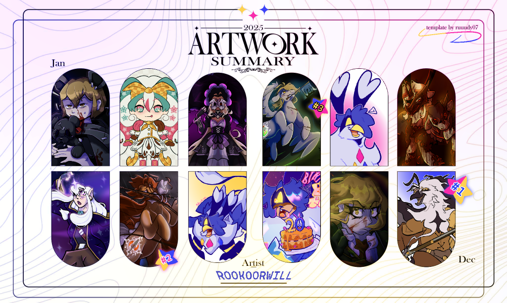 My yearly art summaries! In these, I showcase one of my favorite or most exemplary pieces from each month of the year, complete with personal rankings and pretty colors!
